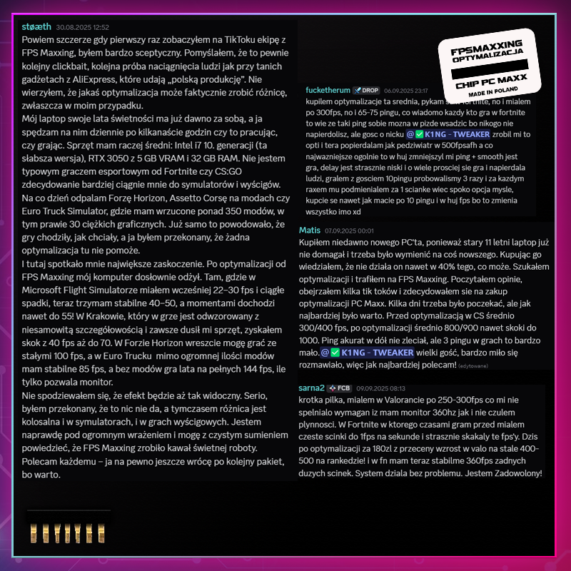 FPS Maxxing to nie tylko optymalizacje, to gracze którzy rozumieją twoje potrzeby, community które nie traktuje nikogo z góry, tylko jak swojego przyjaciela.